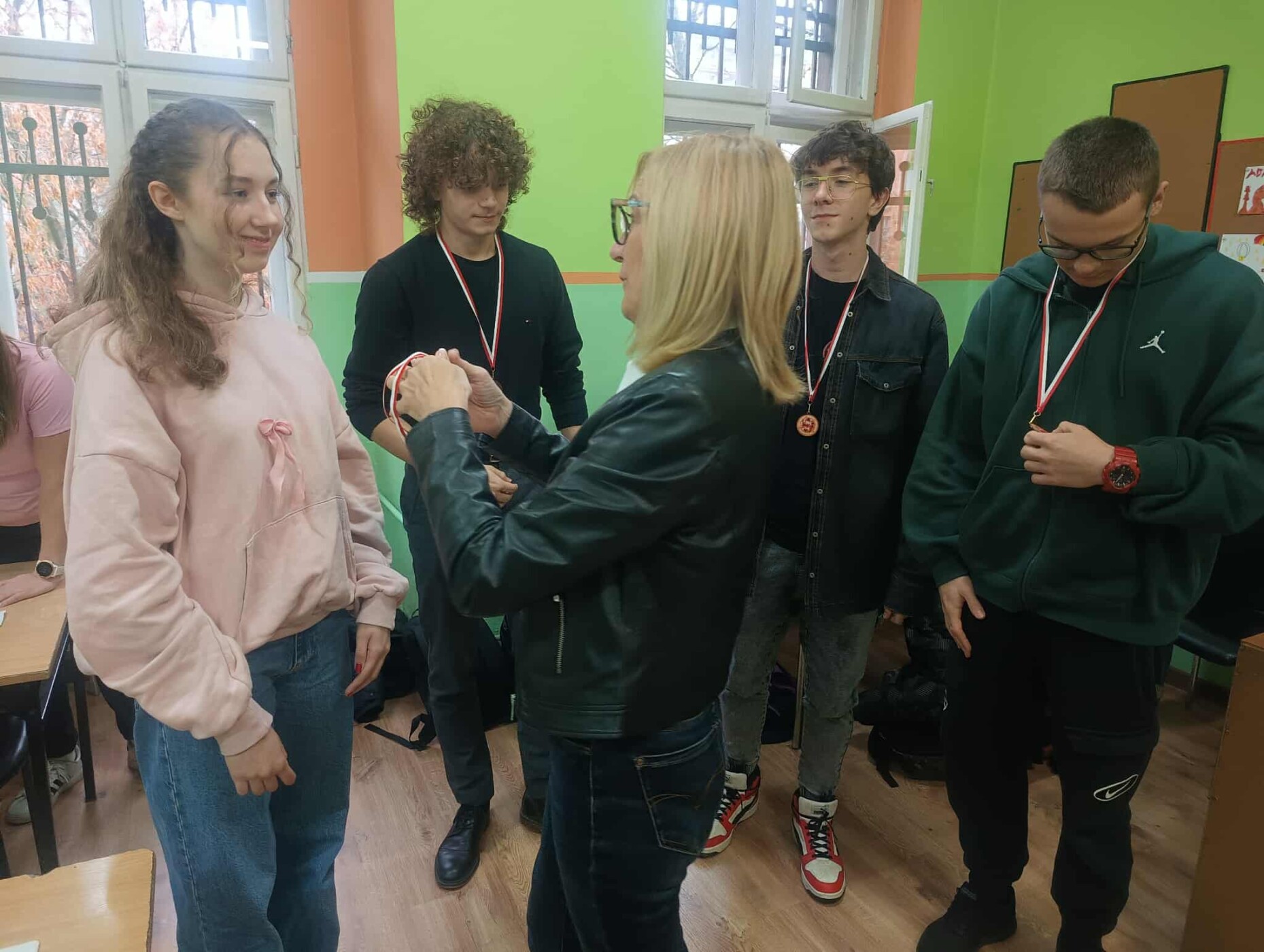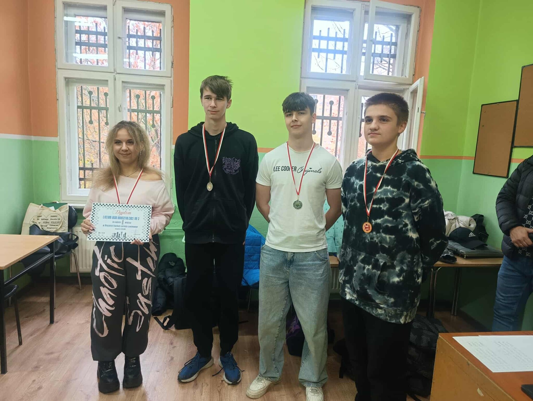 Czwórka nagrodzonych uczniów mysłowickiej szkoły ponadpodstawowej pozuje z medalami do pamiątkowego zdjęcia