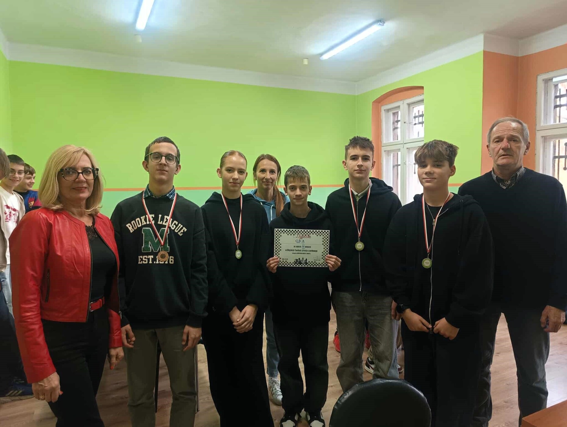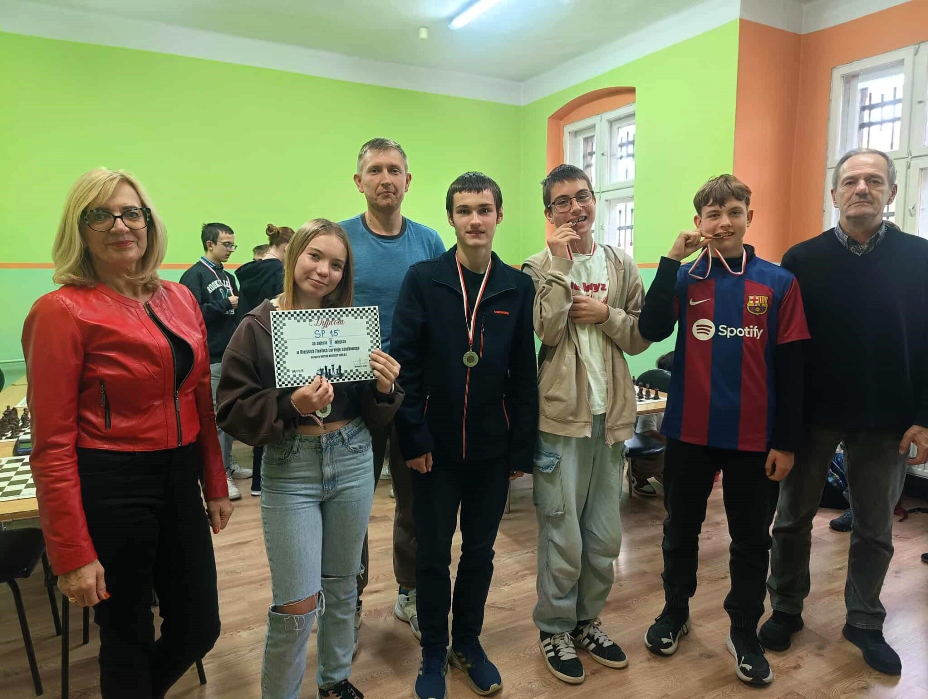 Nagrodzeni szachiści pozują do zdjęcia z medalami