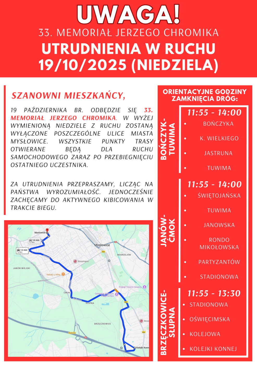 Szanowni mieszkańcy, 19 października br. odbędzie się 33 Memoriał Jerzego Chromika. W związku z organizacją największej imprezy biegowej w naszym mieście informujemy, że z ruchu zostaną wyłączone poszczególne ulice miasta Mysłowice.