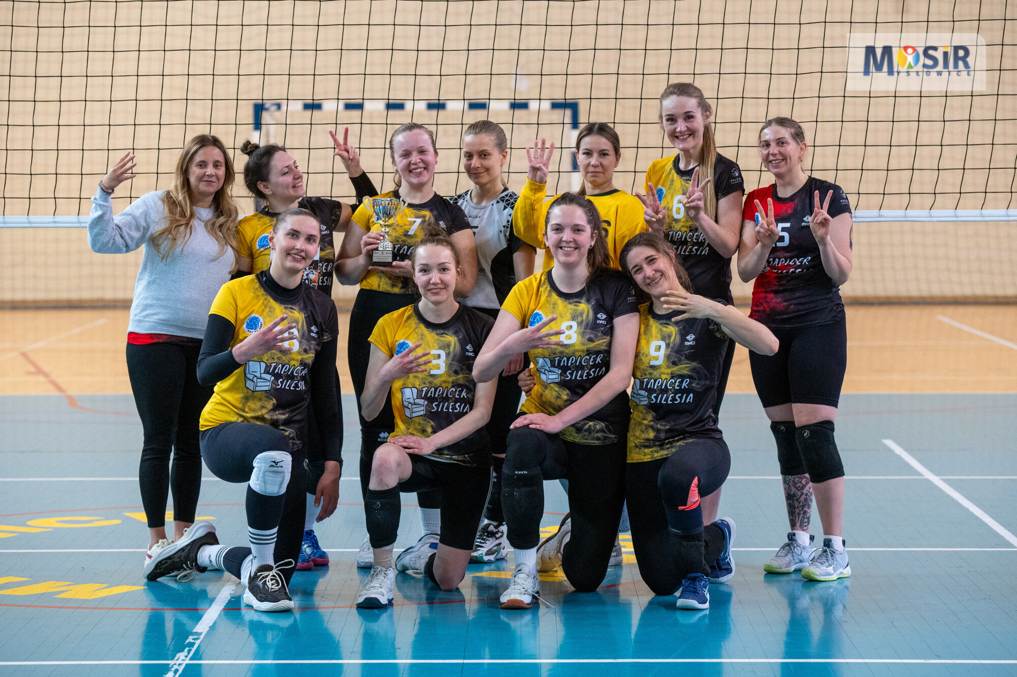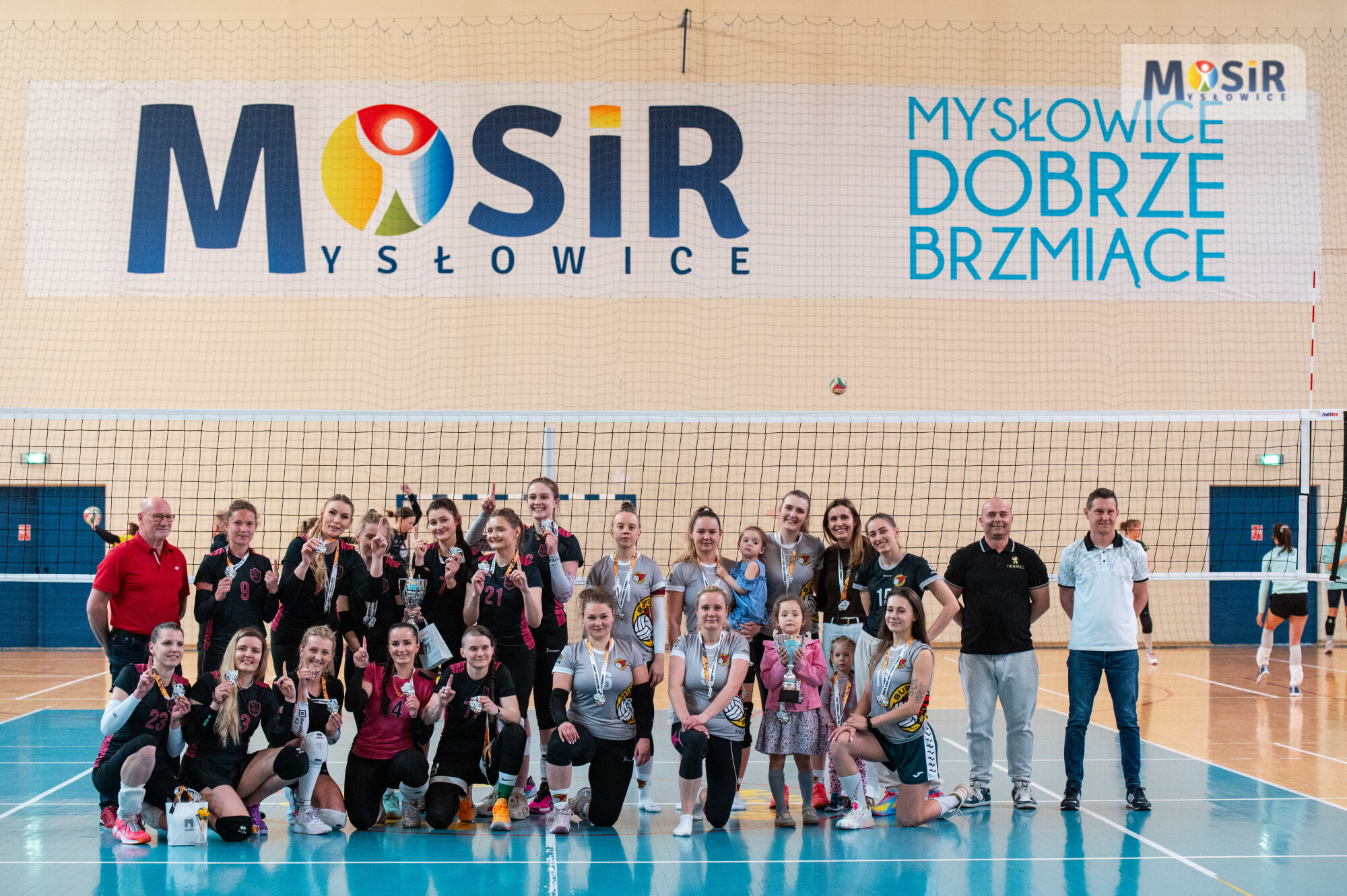 Siatkarki z medalami i pucharami pozują w hali sportowej. Napis na banerze: MOSiR Mysłowice, Mysłowice dobrze brzmiące.
