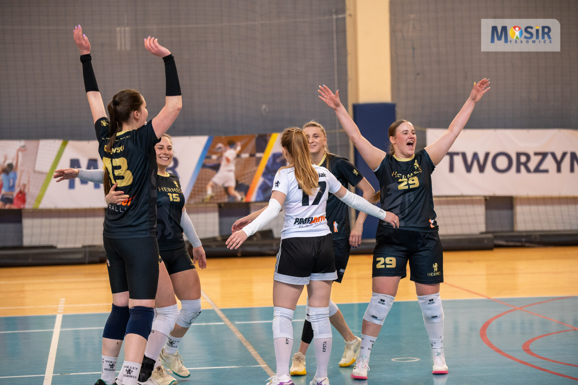 Siatkarki na boisku w hali MOSiR Mysłowice cieszą się ze zdobytego punktu, unosząc ręce w górę.
