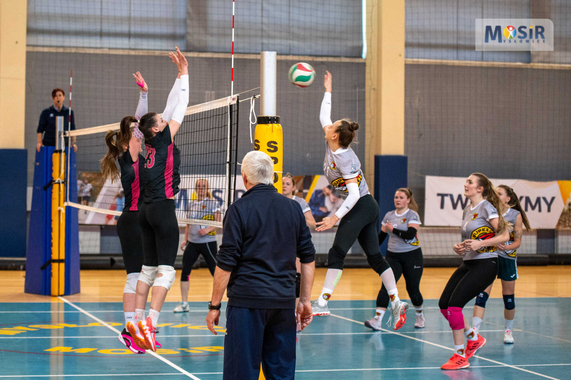 Siatkarki w żółtych i czarnych strojach Hermes podczas akcji przy siatce na hali sportowej z logo MOSiR Mysłowice.