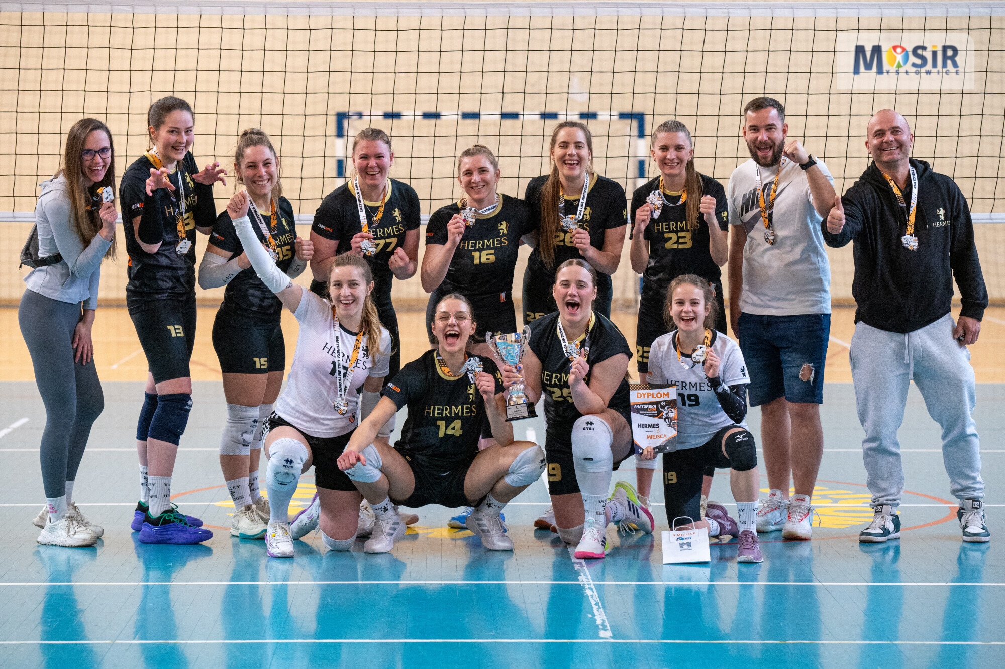 Żeńska drużyna siatkarska Hermes pozuje z medalami, pucharem i dyplomem na boisku MOSiR Mysłowice.