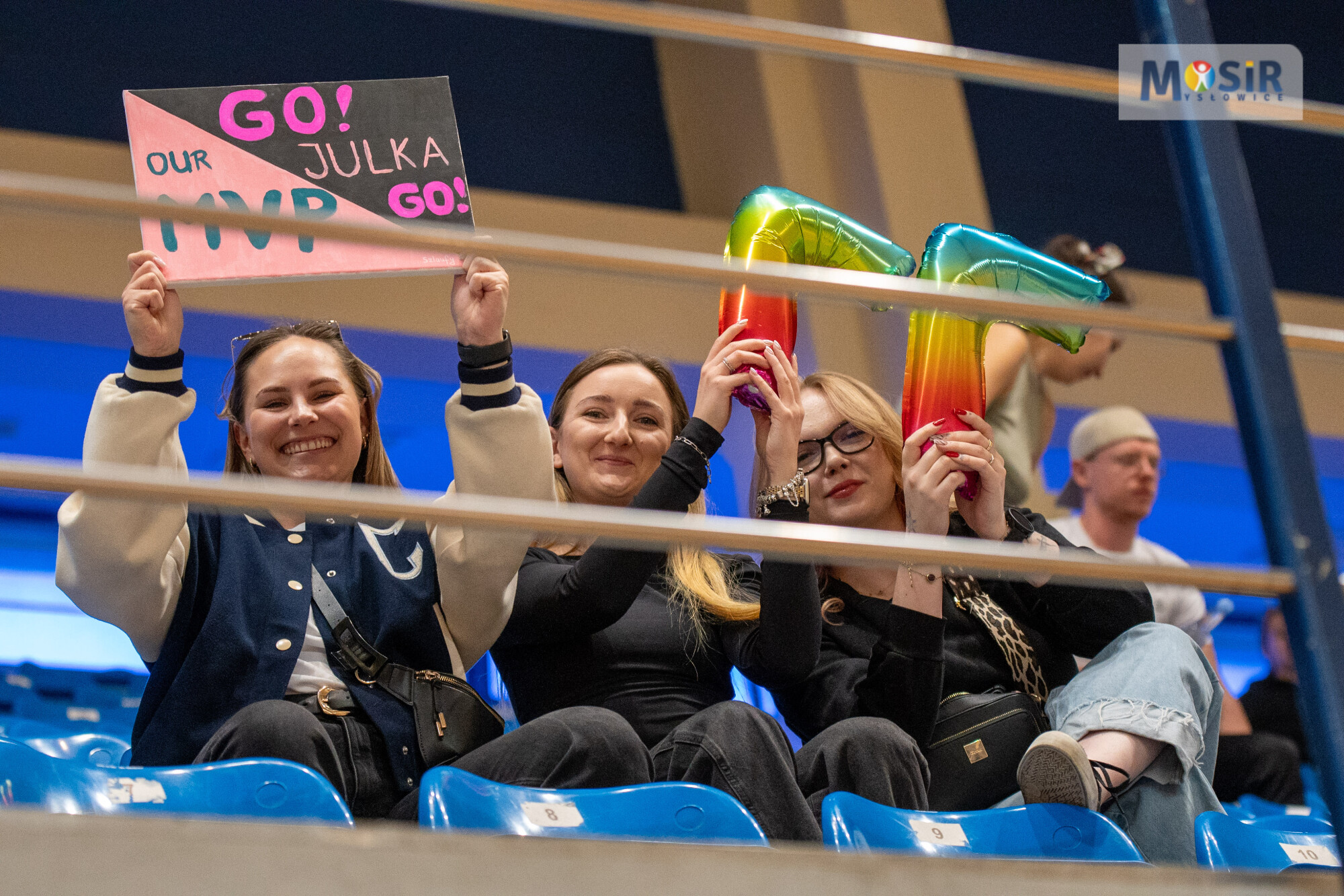Uśmiechnięte kobiety na trybunach. Jedna trzyma transparent z napisem: GO! JULKA GO! OUR MVP, a druga tęczowe balony w kształcie cyfry 7.