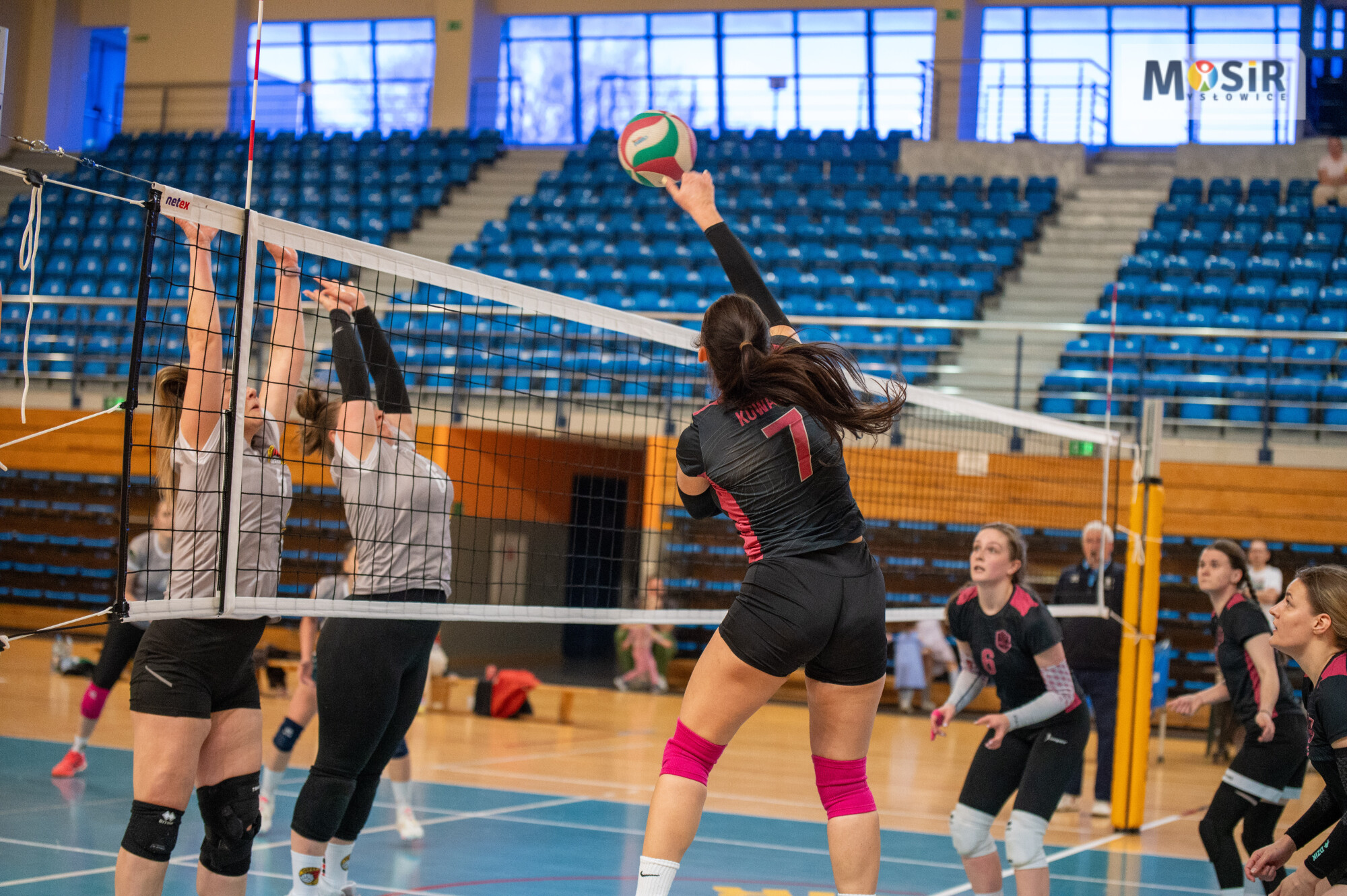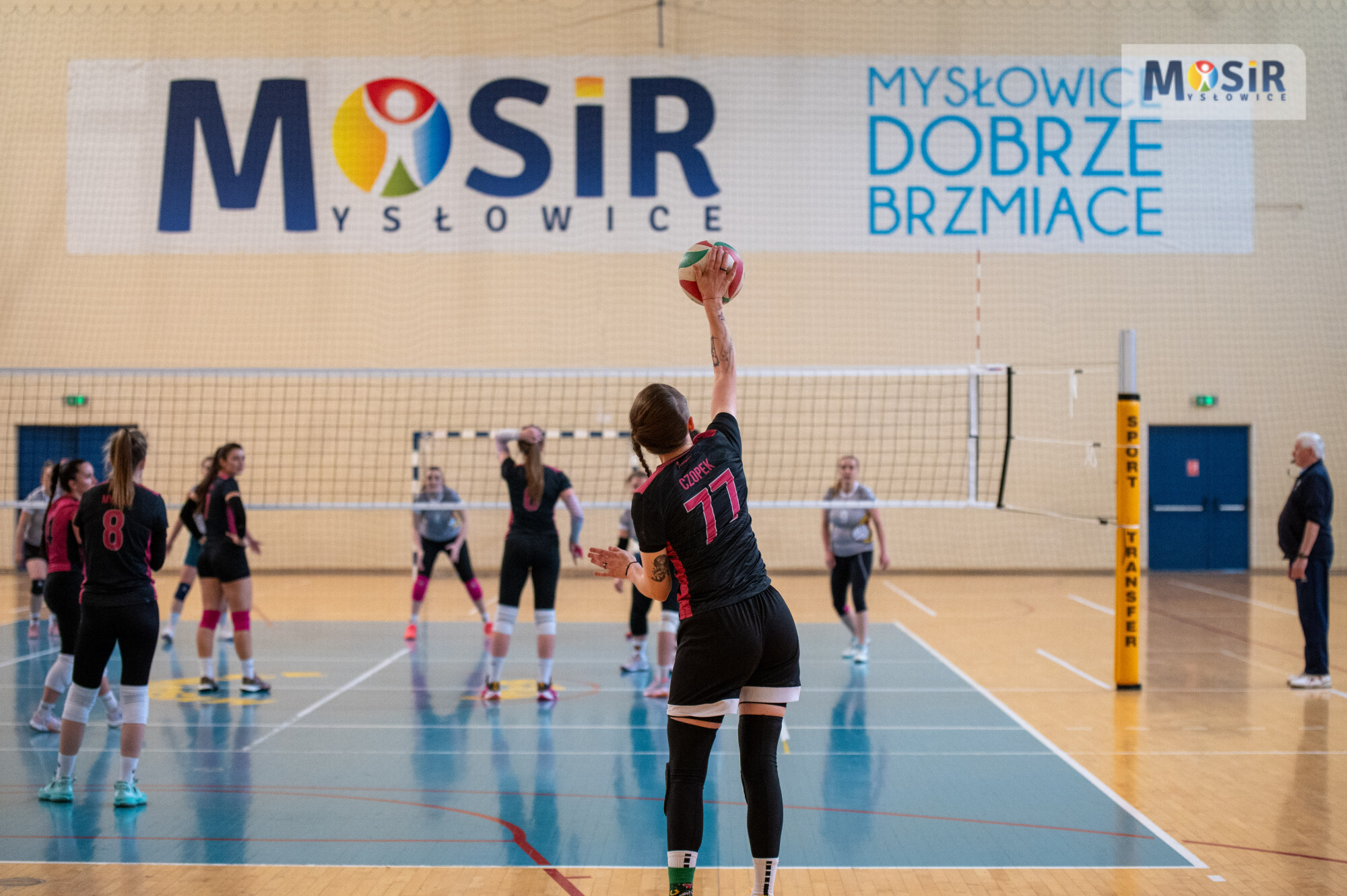 Siatkarka serwuje piłkę nad siatką. W tle baner z napisem MOSiR Mysłowice oraz hasłem Mysłowice Dobrze Brzmiące.