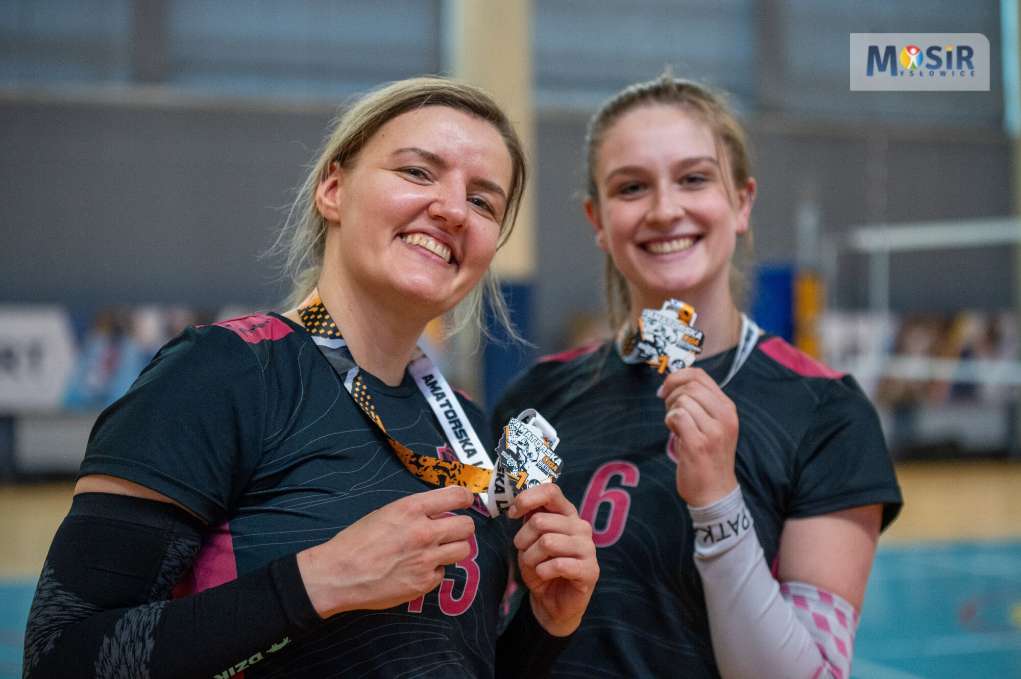 Uśmiechnięte siatkarki z medalami na boisku sportowym MOSiR Mysłowice.