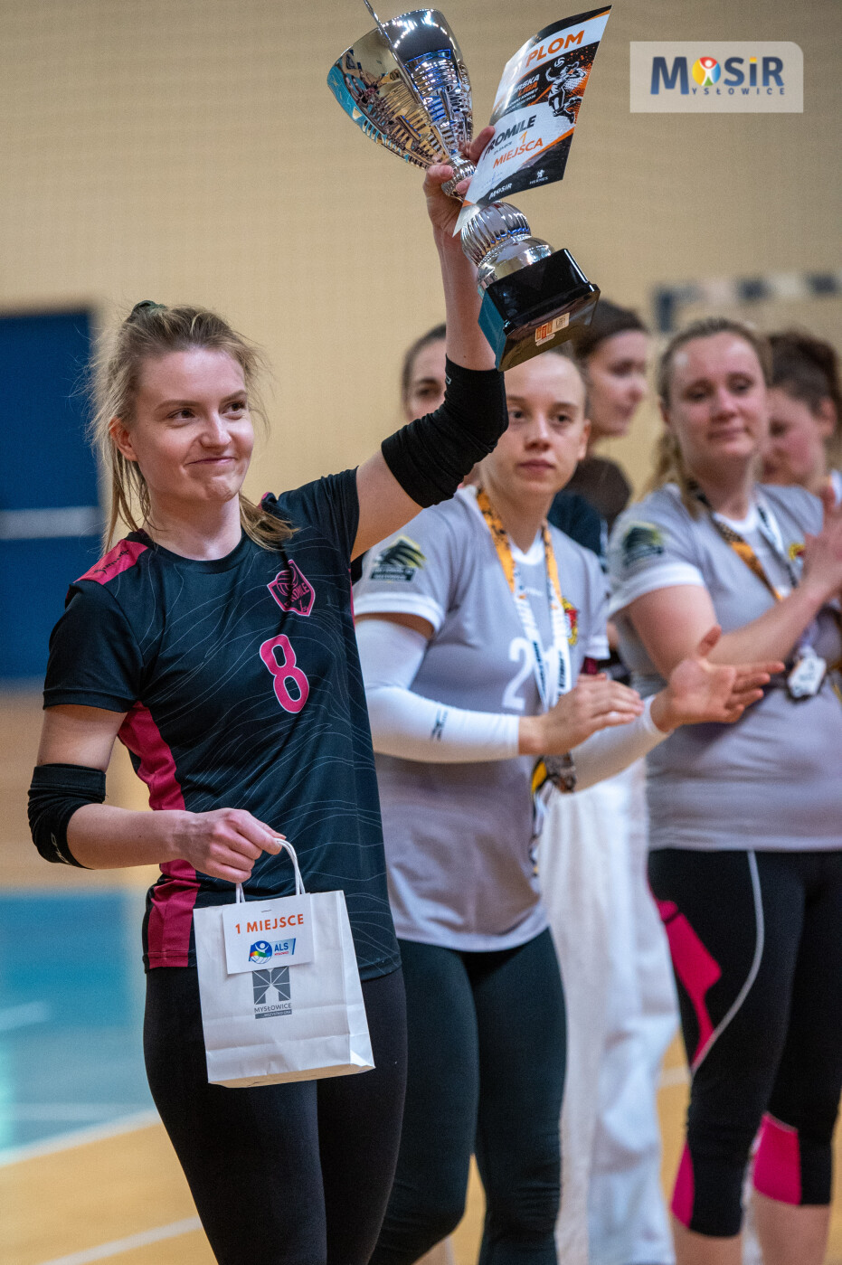 Zawodniczka z numerem 8 trzyma puchar i dyplom za zajęcie 1 miejsca przez drużynę Promile. W tle klaszczące koleżanki z zespołu.